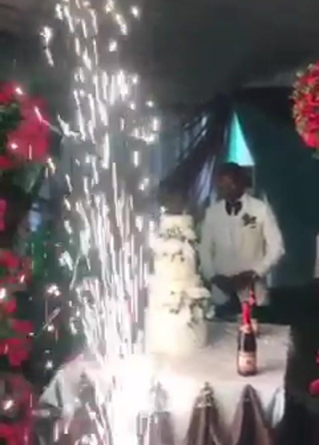 wedding reception, with a groom in a white suit standing behind a four-tier white wedding cake, preparing to cut it. There is a bottle of champagne on the table next to the cake. A sparkler display is emitting sparks in front of the table. Red flower arrangements are visible on either side of the scene. Another person, likely a guest, is partially visible on the right, and other people are blurred in the background to the left. The event is taking place under a tent or canopy with draping fabric.