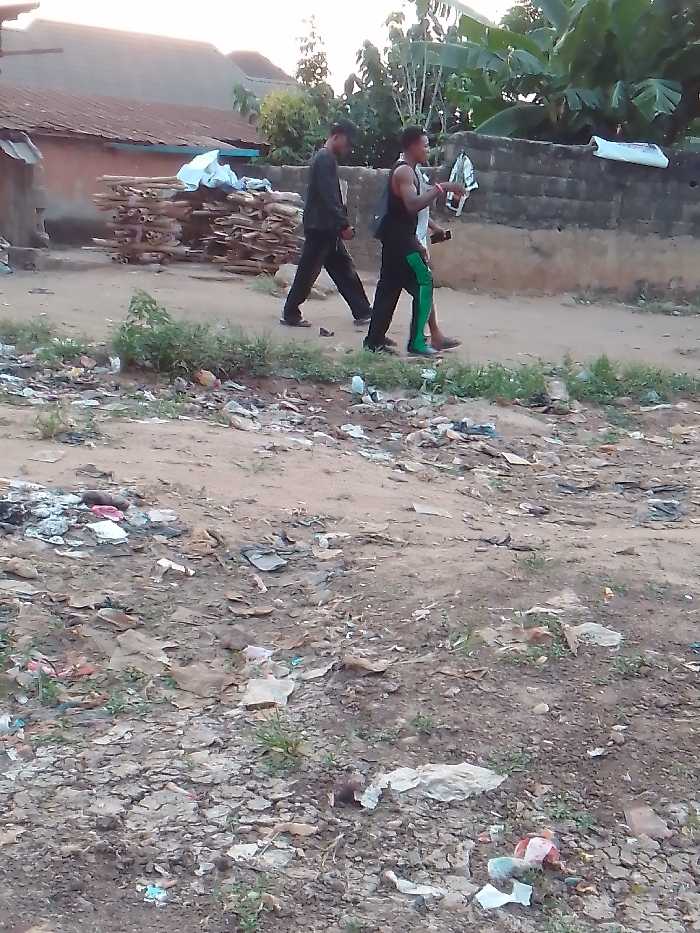 A dirt road filled with trash and debris is in the foreground of the shot. Beyond the road, there are three individuals walking along a dirt path. To the left of the individuals is a stack of lumber next to a building with a rusty roof. In the background are green trees and a concrete wall.