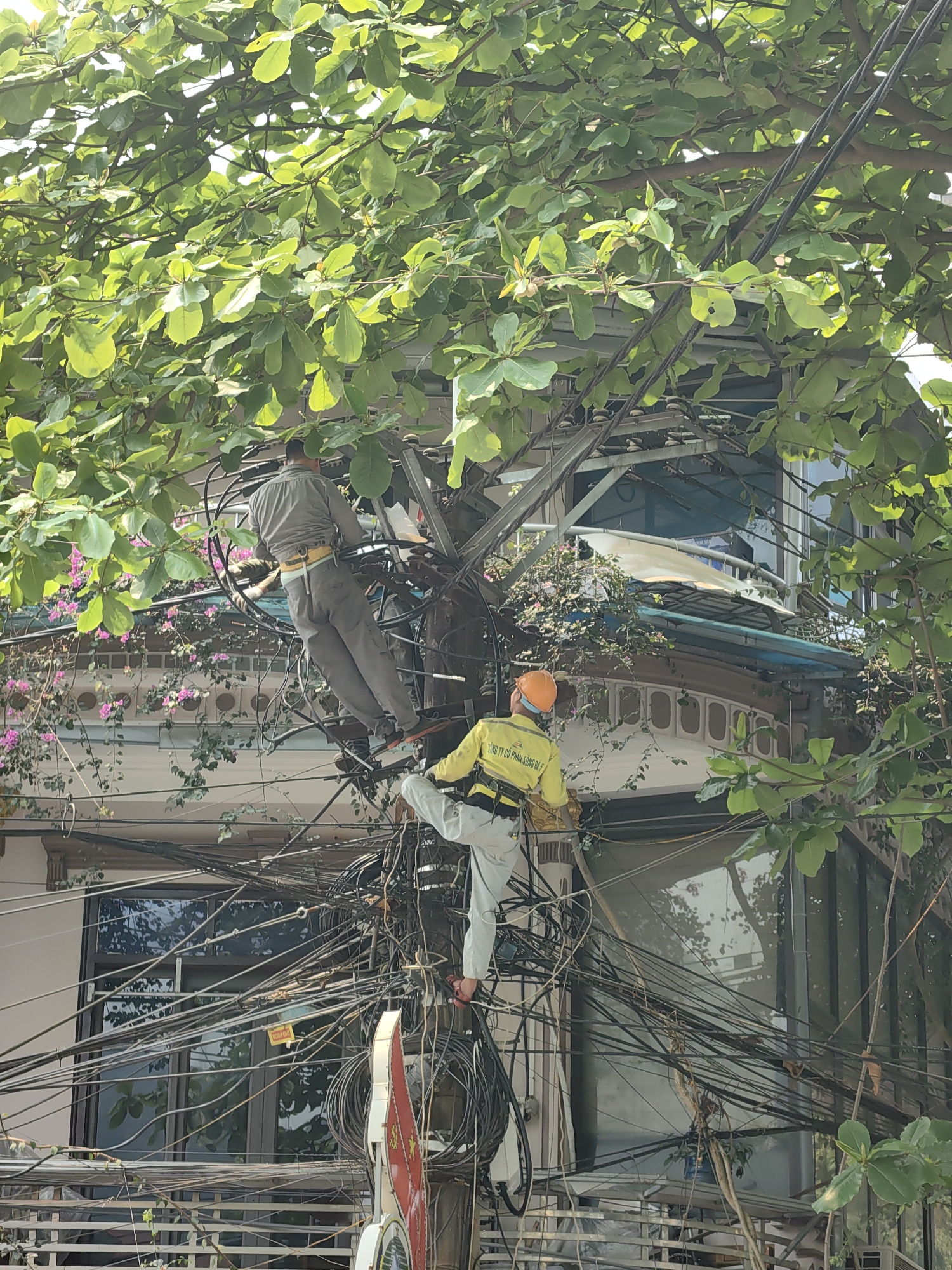 Two electrical workers are suspended in a mass of tangled power lines in Thành phố Hà Giang, Vietnam