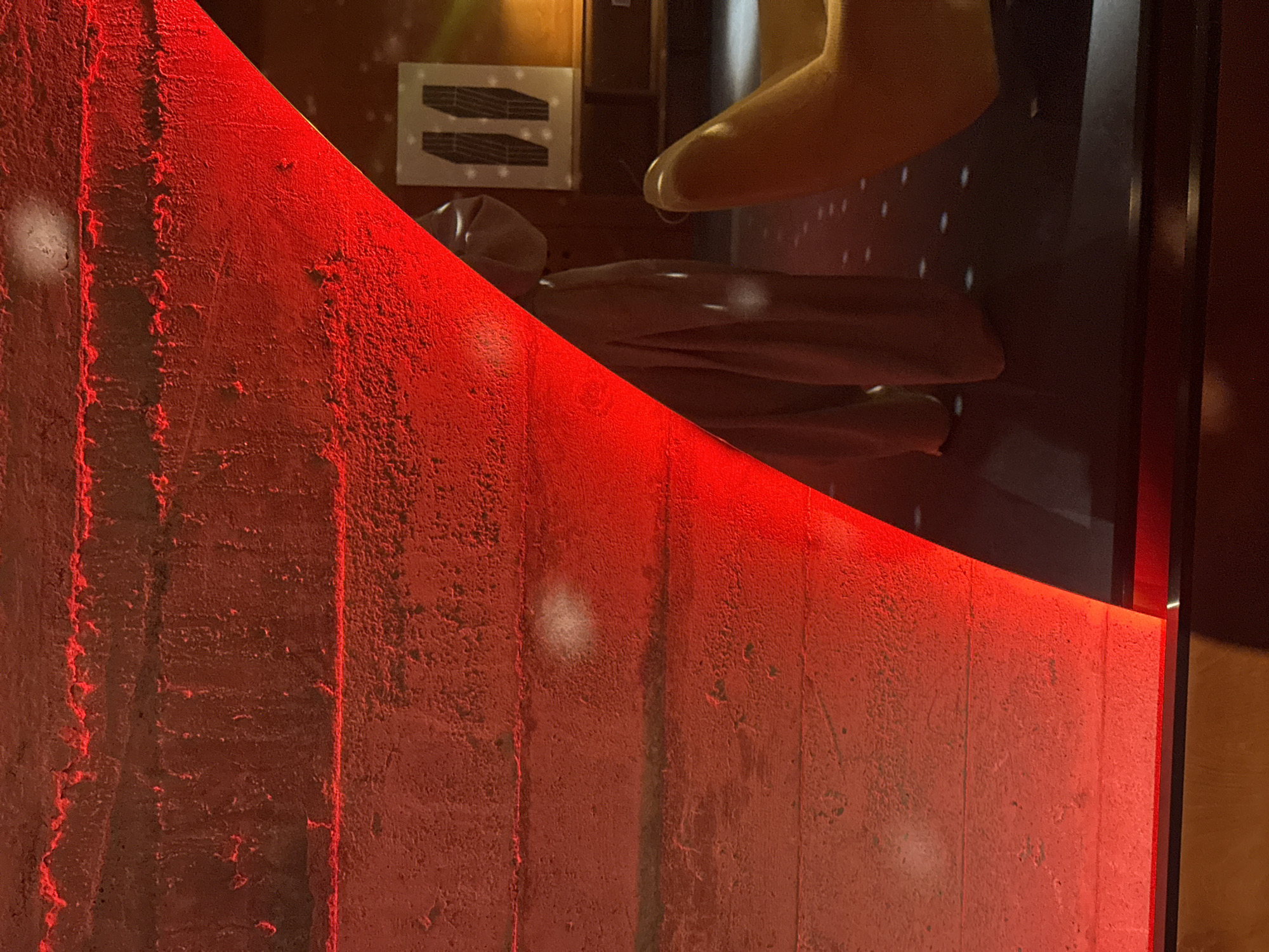 - "A close-up shot shows a portion of a concrete wall bathed in red light, positioned in front of a display case" by FM-lh4BM2, licensed under CC BY 4.0
