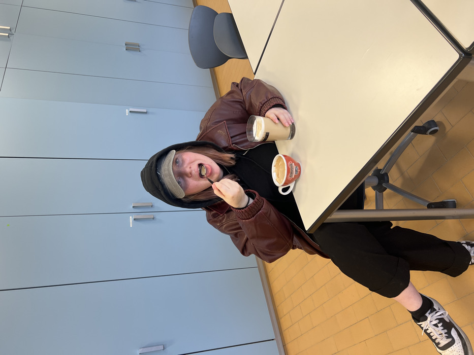 An individual is seated at a light-colored rectangular table in an indoor setting. The person, a young adult, is facing the viewer, actively consuming a light brown substance from a red and white cup with a small, dark-colored spoon, her mouth open. She is dressed in a black hooded sweatshirt with the hood pulled up, a green-grey baseball cap visible underneath, a dark brown leather jacket, black wide-leg trousers, and white sneakers with black accents. Her left hand rests near a clear glass containing a layered light brown and white beverage with foam. The background consists of multiple light blue floor-to-ceiling storage cabinets equipped with silver handles. The floor is covered with light brown square tiles. An additional dark grey office-style chair is partially visible behind the table. The specific location within the city of Heilbronn, Germany, cannot be determined from the visual evidence.