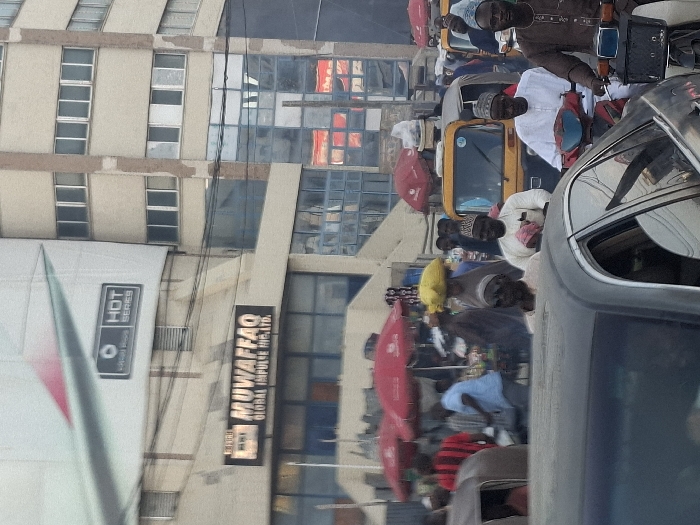 The image depicts a congested urban street scene in Unknown, Unknown, under daylight conditions. The primary background features a multi-story building. The upper section of this building displays a large billboard with partially visible text "HOT SERIES" and an Infinix logo. Below the billboard, a black sign reads "MUWAFFAQ GLOBAL IMPULSE NIG. LTD." The building's facade consists of light-colored panels and blue-tinted reflective windows. To the right, another multi-story building with a lighter facade and numerous windows is visible. At street level, the scene is bustling with traffic and pedestrians. Several red market umbrellas are prominently displayed in the mid-ground, indicating vendor stalls or a market area. Numerous people are present, many wearing traditional attire, including tunics and kufi caps. One individual is observed carrying a large yellow item on their head. In the foreground and mid-ground, various vehicles are present, including a dark-colored sedan partially visible on the left. Multiple three-wheeled auto-rickshaws (one yellow, central) and motorcycles are part of the dense traffic. At least two men on motorcycles, dressed in traditional attire, are in the immediate foreground, one on a red scooter. Overhead wires traverse the upper part of the image. The environment is indicative of a busy commercial area with significant pedestrian and vehicular movement.