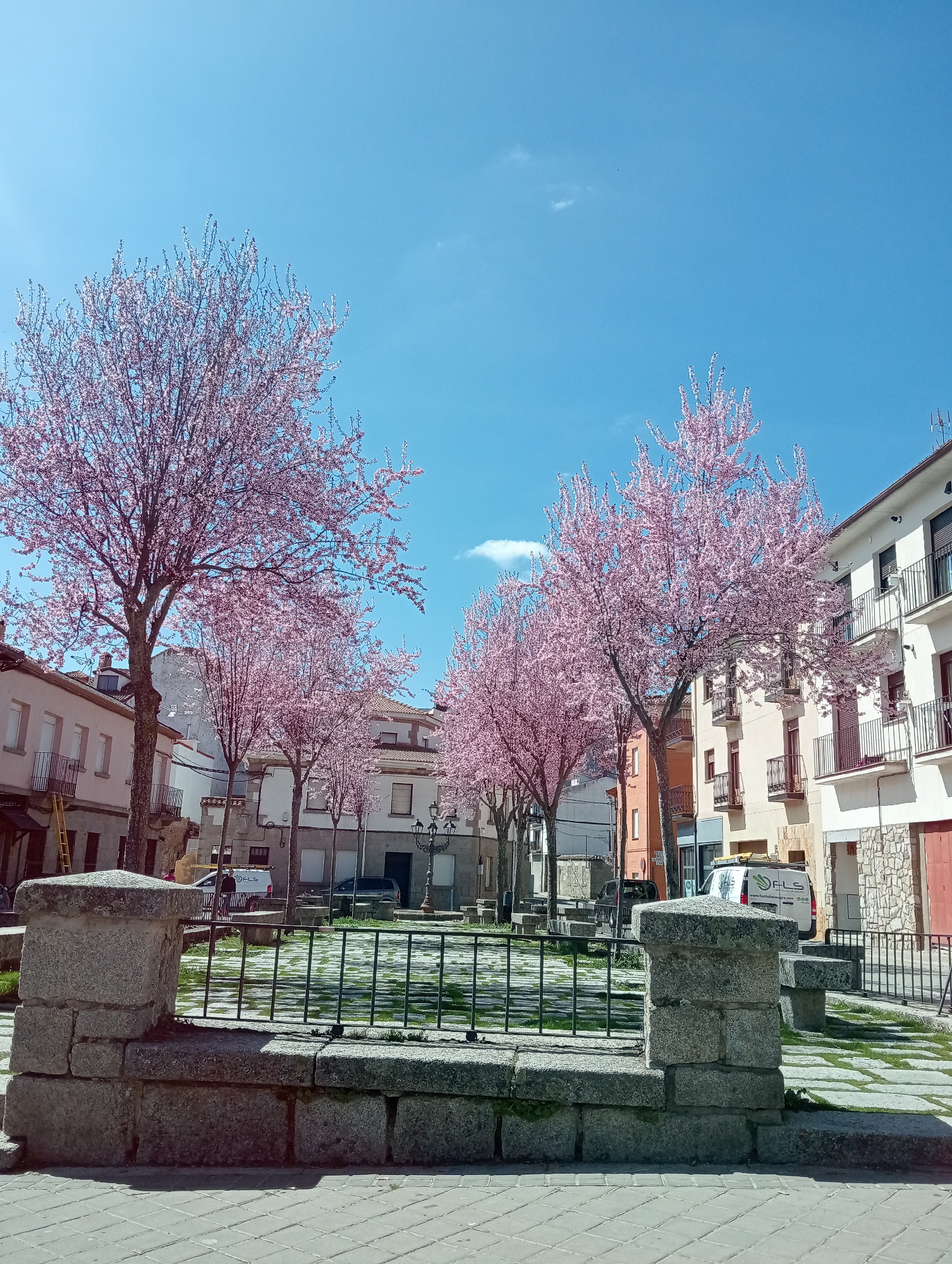 This image depicts a sunlit public square in El Espinar, Spain, during springtime