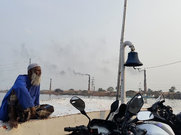 The image depicts a riverine industrial landscape in Narayanganj, Bangladesh, observed from a vessel such as a ferry. An elderly man, presumed to be of South Asian descent, is seated cross-legged on a light-colored surface, possibly a deck or railing. He possesses a long white beard, wears a white prayer cap (kufi), a blue long-sleeved tunic, and a patterned lungi, and is barefoot. He looks towards the right with a slight smile. In the immediate foreground, the handlebars and rearview mirrors of at least two motorcycles are visible. A white pole with a dark bell attached stands vertically on the vessel, positioned between the man and the motorcycles. Across the water, the distant bank features multiple tall industrial chimneys, characteristic of brick kilns or factories, several of which are actively emitting dark grey smoke. Power transmission towers and sparse foliage are visible between the chimneys. The sky is a uniform, hazy light grey. The scene encapsulates a convergence of river transport, human presence, and active heavy industry in a specific geographical context.