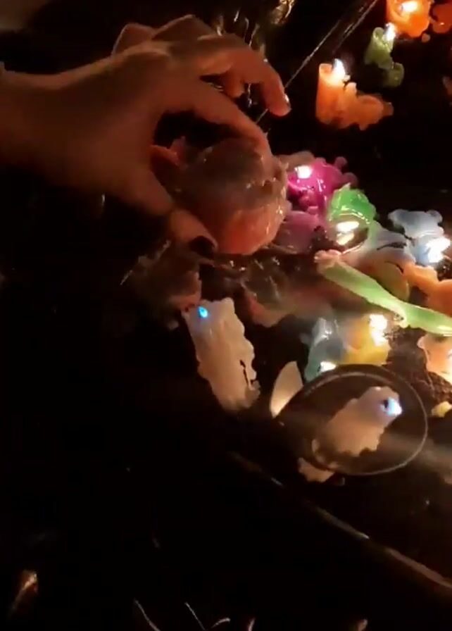In a close-up, low-light shot, a hand is shown holding a spherical object of reddish-brown color, possibly a wax ball, over a collection of melted candles