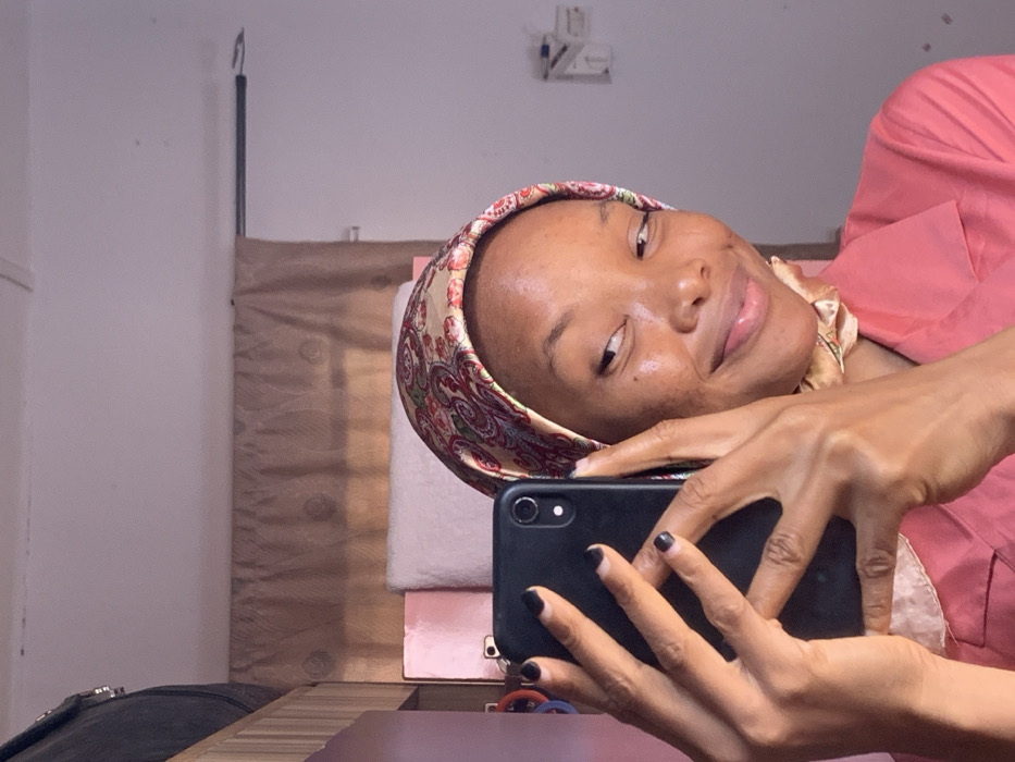 A young adult female with medium-dark skin is depicted from the chest up, taking a selfie in an indoor setting within Ilorin, Nigeria