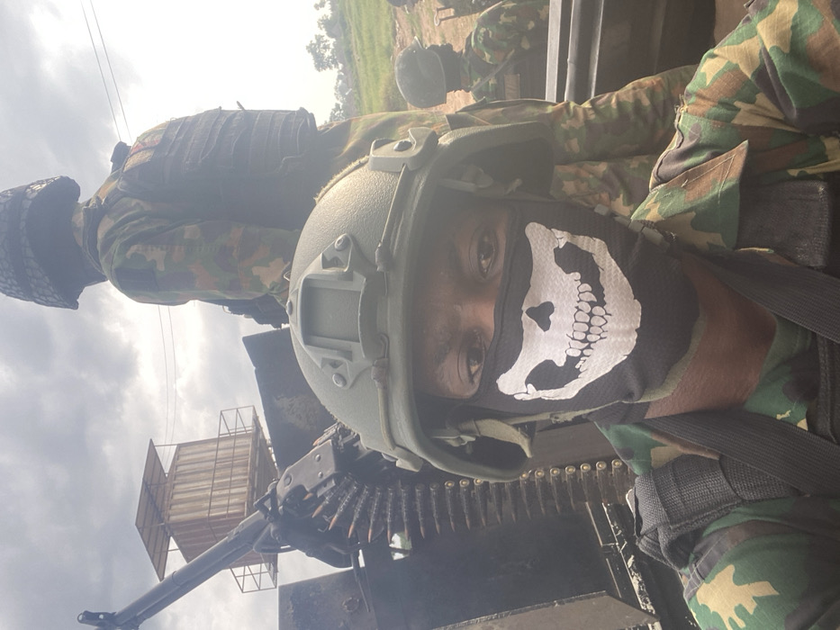 The scene is located in Zaki Biam, Nigeria, under an overcast sky. In the foreground, a male soldier is depicted from the chest up, taking a selfie. He wears an olive drab combat helmet, a black face mask with a white skull graphic, and a camouflage uniform with a tactical vest. His eyes are visible, looking directly at the camera. Immediately behind him and to his right, another soldier is partially visible from the back, wearing a camouflage helmet with netting and a matching uniform. To the left of the foreground soldier, a heavy machine gun is mounted on what appears to be a military vehicle, with a loaded ammunition belt clearly visible. In the mid-ground, a raised observation post, constructed from a repurposed shipping container on a metal scaffold, stands against the sky. Distant vegetation and additional uniformed personnel are partially visible in the far background.