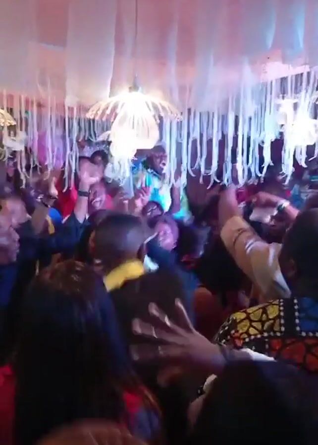 group of people dancing at what appears to be a celebratory event or party. The room is decorated with white fabric draped from the ceiling and illuminated with blue and white lighting. Several light fixtures resembling jellyfish are hanging above the crowd. The people are dressed in a variety of colorful clothing, and they are raising their hands and moving to the music. The camera is positioned within the crowd, capturing the energy and excitement of the event. Some people are visible using their phones to record.