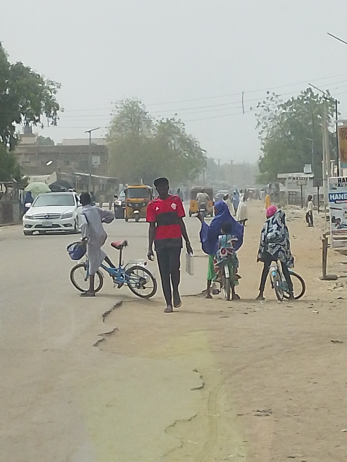 The image displays a street scene in Hotoro South, Nigeria, under a hazy, light-grey sky