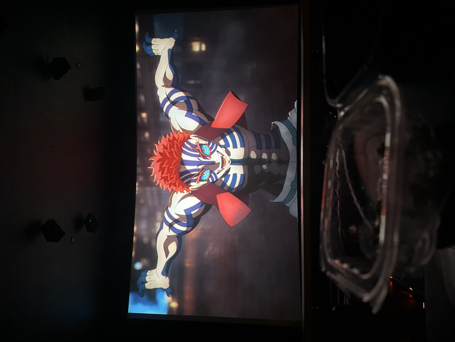 This image depicts a darkened movie theater in Paradise, United States, where a large, curved screen displays an animated character. The character, Akaza from *Demon Slayer*, is a muscular male with bright red spiky hair, prominent blue striped markings across his white skin, light blue eyes with white pupils, and sharp teeth. He wears a short red cape/shawl and a dark, armored midsection garment over white pants. His arms are outstretched to the sides, hands open, with blue glowing energy emanating from his left hand. His facial expression is aggressive, with an open mouth suggesting a roar. The background of the animated scene is a dark, blurred urban or industrial setting with faint distant lights. In the immediate foreground, a clear plastic clamshell-style container is partially visible, appearing to hold dark, granular contents, likely a snack. Above the screen, two black, cuboid speakers are mounted on the dark ceiling. The overall environment is dim, consistent with a cinema during a showing.