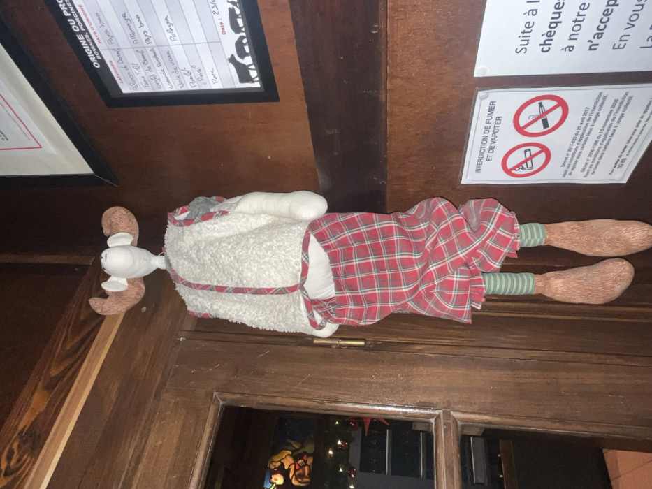 A decorated wooden door with various signs and a stuffed animal atop. One sign details "Origine ou Production Bovines/Porcines" with categories like "Paleron of Doroff" and "Noix de veau." A "No Smoking" sign is also visible. The stuffed animal features a white head with brown ears, a white, fluffy body, and a red plaid dress. Its brown legs are horizontally positioned across the door. In the doorway’s reflection, parts of a Christmas tree can be seen.