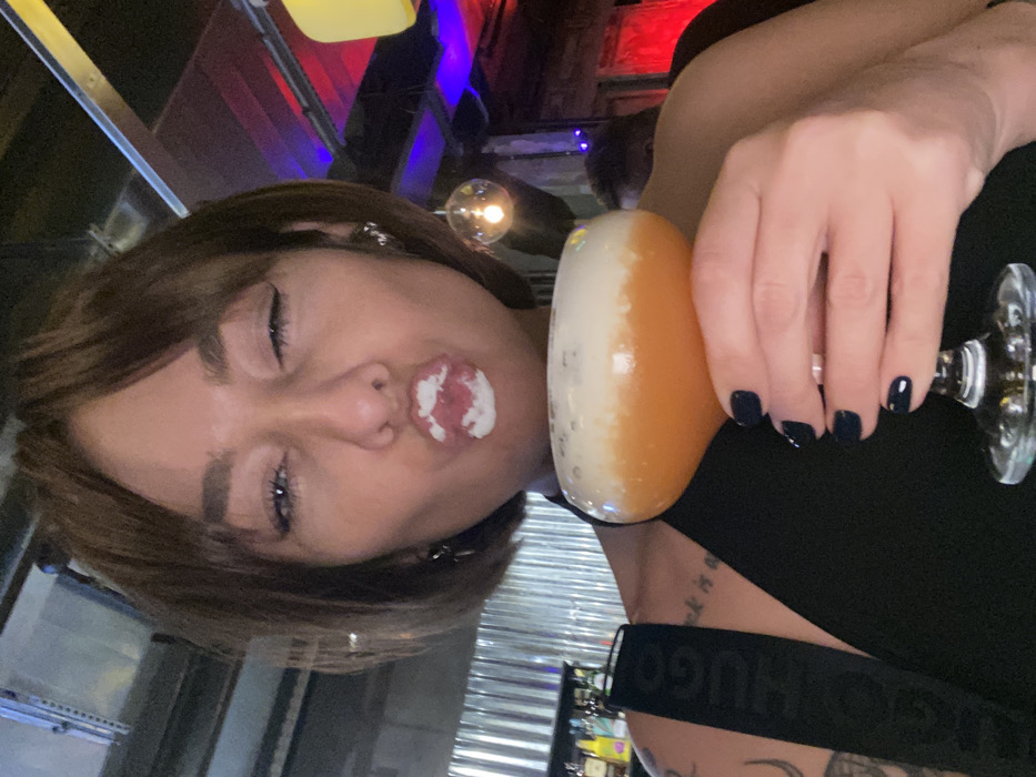 - "A woman with short brown hair holds a drink with a white foam top and a brownish-orange base" by FM-pez9w2, licensed under CC BY 4.0