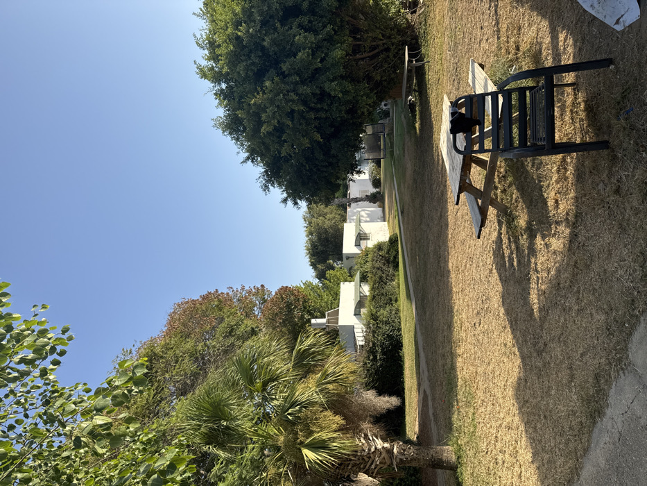 The image depicts an outdoor scene within the Hof Ashkelon Regional Council, Israel. The foreground features dry, yellowish grass, with a concrete edge visible on the far left. A wooden picnic table with attached benches is present in the right foreground, accompanied by a black, slatted outdoor chair positioned facing away from the camera, on which a dark garment is draped. To the left, a large palm tree with prominent fronds stands, and the upper left corner shows foliage from another tree with heart-shaped leaves. A dirt path extends into the midground, leading towards a cluster of white, single-story buildings with green awnings, partially obscured by dense green hedges. One building features a rectangular metal vent on its roof. A large, bushy green tree dominates the right side of the midground, under which a second wooden picnic table is partially visible. The background consists of additional trees and vegetation under a clear, bright blue sky. No individuals are visible, and no active interactions are occurring. The scene is illuminated by natural light, casting long shadows to the left, suggesting either early morning or late afternoon.