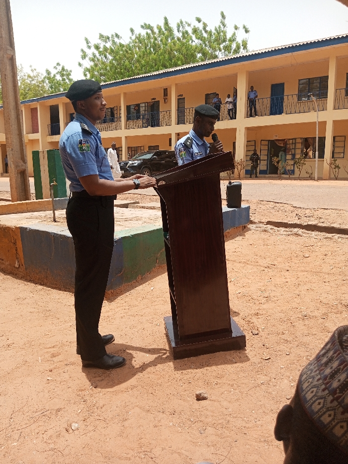 man in a police uniform standing to the right of a wooden podium. A second, unidentified, man is speaking into a microphone at the podium. There is a black car in the background, and several other people are visible walking through the courtyard. The environment is that of a public courtyard, and the sandy ground suggests the image was taken in the arid, dusty region of Gwadan Gaji, Nigeria. The coordinates provided indicate a location in Gwadan Gaji, Nigeria.