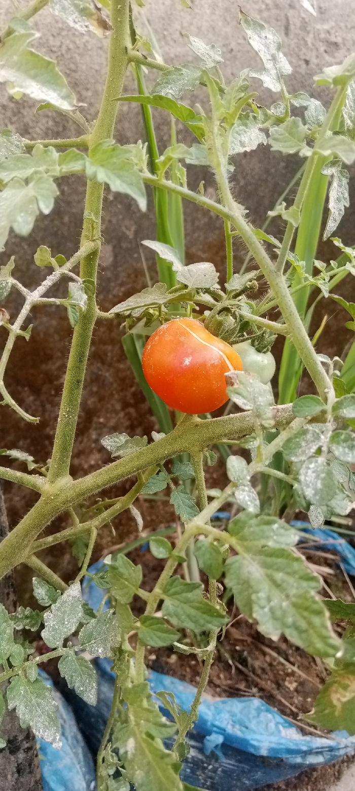 A close-up captures a tomato plant with one ripe red tomato. The tomato hangs amidst green leaves and stems, all covered with a dusting of white specks. A wall is partially visible in the background. The plant is growing in what appears to be a blue plastic-lined container. Some taller green plants can also be seen behind the tomato plant.