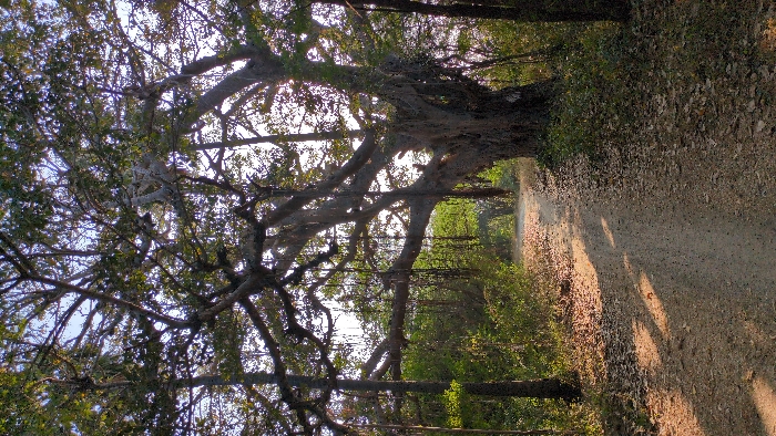 The image presents a dirt path traversing a wooded area in Tiruvannamalai, India. The unpaved path, light brown with scattered dry leaves, extends from the foreground, curving gently to the left and receding into the background. A large tree, consistent with a Banyan (Ficus benghalensis), dominates the right side of the frame, characterized by a thick, gnarled trunk and numerous aerial roots descending from its extensive branches, which overhang the path. Other trees with dense green foliage line both sides of the path, forming an overhead canopy through which natural sunlight filters, creating dappled light and elongated shadows on the path. Sparse green undergrowth is visible along the path's edges. No human subjects or manufactured objects are present in the scene.