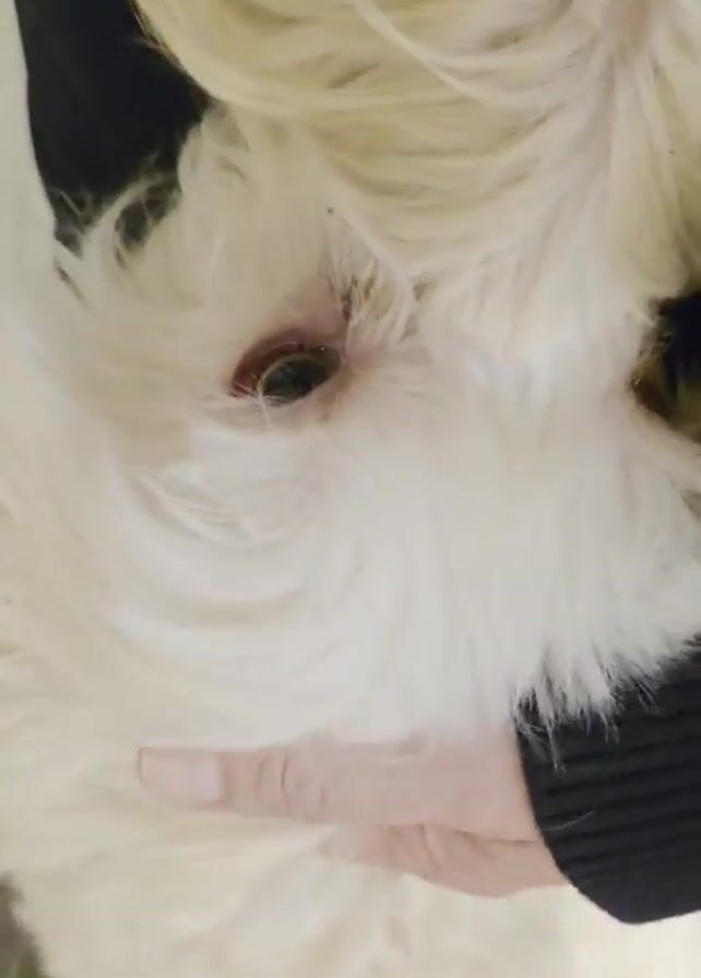 close-up view of a small, fluffy white dog being held by a person. The dog is lying on its back, its head resting in the person's hand. The dog's eyes are open and looking up. The person is wearing a black sweater. The background is a gray surface that could be a couch or carpet. The camera focuses on the dog's face, particularly its eyes and fur. There is a low grumbling noise present.