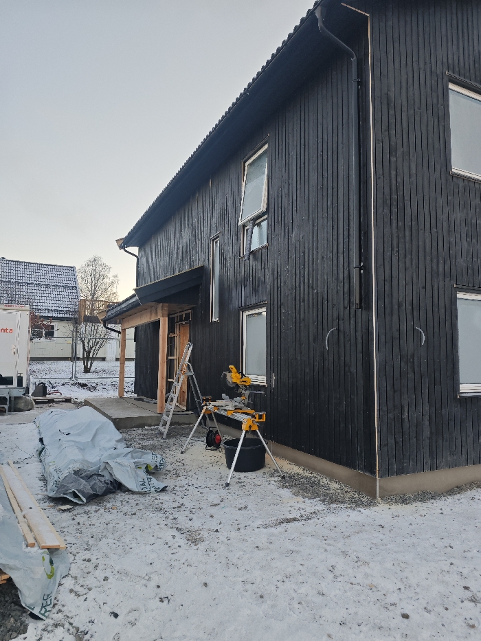 The scene depicts a two-story residential building located in Ottestad, Norway, undergoing construction or renovation during winter. The ground is covered in a thin layer of snow. The house features vertical black wooden siding and a dark pitched roof with a black gutter system. Multiple windows with white frames are visible, with one on the second floor partially open. A partially completed wooden porch area with exposed light-colored timber framing and a dark overhang is present at the entrance. In the foreground, a yellow DeWalt miter saw is set up on a matching yellow stand, accompanied by a black bucket and a red power cord. A silver A-frame ladder leans against the house near the porch. To the left, a pile of construction materials is covered with a white tarp, and several wooden planks are visible. In the background, a white utility trailer with partial branding "unta" is parked, and another snow-covered house with a dark roof is visible further back. No individuals are present in the image.