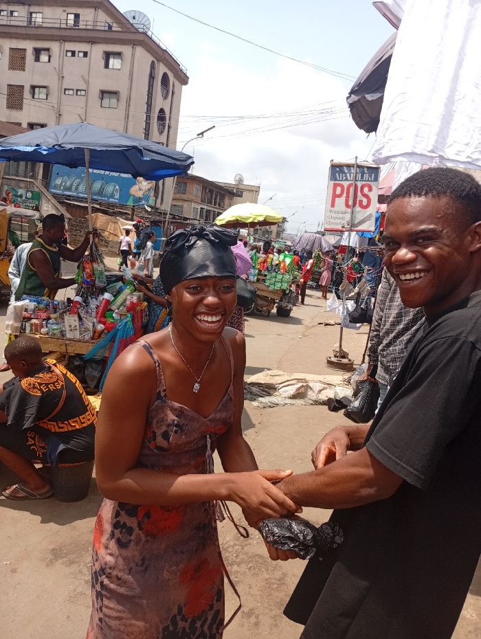 Two people, a woman and a man, smile at the camera while in a bustling outdoor market. The woman wears a printed dress and a head covering, while the man is in a dark shirt. Various vendors and pedestrians fill the background, along with merchandise displays and umbrellas. Buildings are visible in the distance, under a bright sky. The two are mid-handshake, adding to the candid feel of the scene.