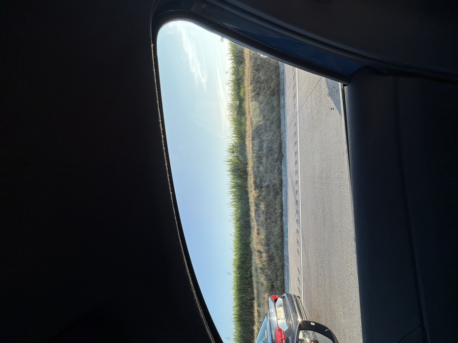 View from a car window shows a stretch of highway with adjacent vegetation against a clear sky. The road is gray with white lines. A car is partially visible in the lower right corner of the frame. The car's interior frame surrounds the outside scenery. The left side is dark, presumably part of the car's interior. The photograph's angle is slightly tilted.