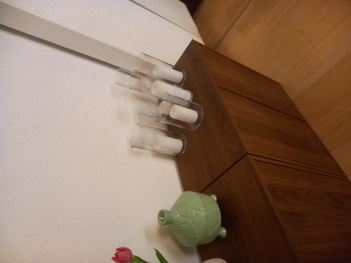 The scene is set indoors within a residence in Burcht, Belgium. The primary subjects are two adjacent dark wooden cabinet units, likely sideboards or storage furniture, extending across the lower half of the frame. The units feature flat top surfaces and vertical paneled fronts. On the left cabinet unit, a light green ceramic lidded pot, adorned with an embossed leaf-like pattern and resting on three small feet, is prominently displayed. To its immediate left, partially visible, is the upper portion of a white vase containing a single red tulip with a green stem. On the right cabinet unit, a collection of approximately six clear cylindrical glass candle holders, each housing an unlit white pillar candle, is arranged. The background consists of a plain white wall. In the lower right quadrant, a light brown wooden floor is visible. A vertical white architectural element, consistent with a door frame or wall corner, is present along the far right edge of the image. No individuals are depicted.