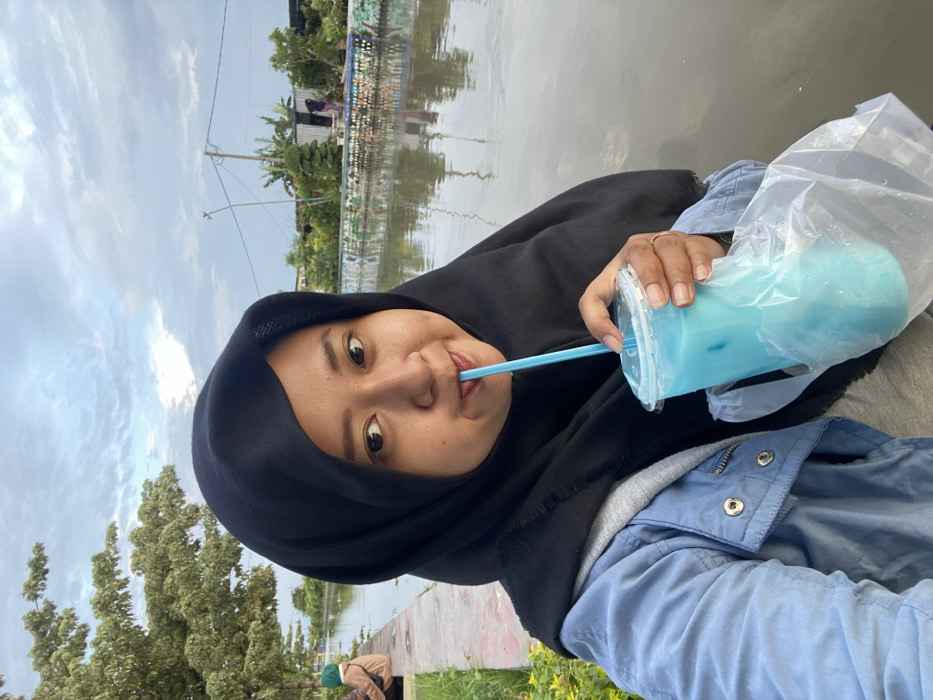 A woman wearing a black hijab, a light blue denim jacket, and a grey undershirt is depicted in the foreground, facing the camera in Kalitengah, Indonesia. She holds a clear plastic cup containing a light blue beverage with a matching blue straw, which she is actively using to drink. The cup is partially contained within a transparent plastic bag. Behind the woman, a calm body of water, consistent with a canal or river, extends into the background. Along the near bank of the water, green foliage and a concrete edge are visible. On the far bank, a low concrete wall is decorated with an array of colorful, possibly recycled, objects. Beyond this wall, green vegetation, utility poles, overhead lines, and distant structures, including a small building, are present. To the far left, another individual wearing a green hijab and a brown garment is seated on the canal's edge, partially obscured. The sky is overcast with scattered clouds.