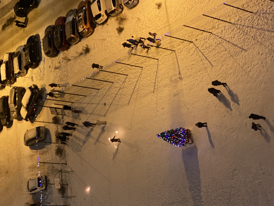 An aerial perspective depicts a snow-covered landscape with cars parked on the left. Several people are walking, their shadows stark against the white snow. A decorated Christmas tree stands out with colorful lights. Rows of poles and string lights add to the scene. The overall ambiance suggests a winter gathering or event.