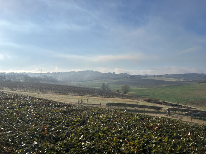 The image depicts a rural landscape near Montepulciano, Italy, under a hazy blue sky with scattered white clouds