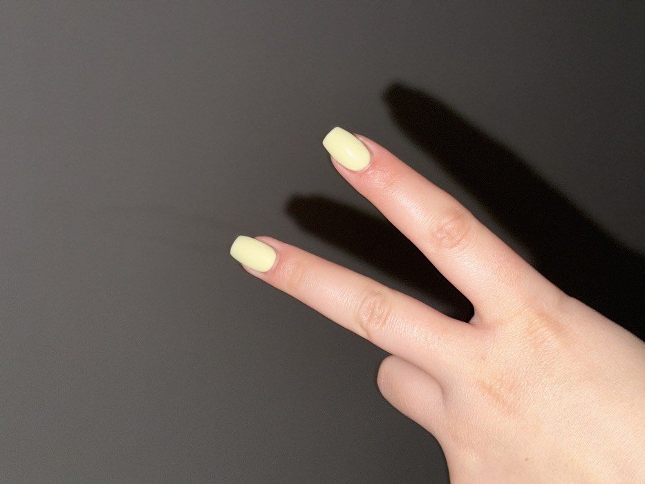 A close-up photograph displays the dorsal aspect of a human left hand against a uniform dark gray background. The hand's skin tone is fair. The index and middle fingers are extended vertically, forming a 'V' gesture. The fingernails on both extended fingers are coated with a matte, pale yellow polish, exhibiting a squoval shape. Distinct shadows of the extended digits are cast onto the background, indicating a light source from the upper left. The remaining fingers are partially obscured or curled. This scene is located in Makiivka, Ukraine.