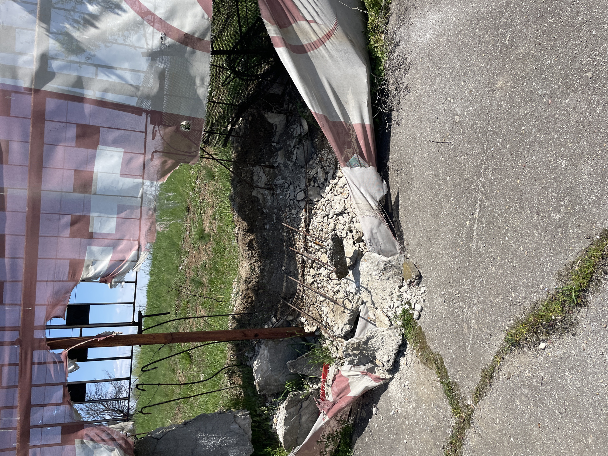 The image depicts damage along the edge of a paved surface, likely a sidewalk or road, in what appears to be an outdoor area