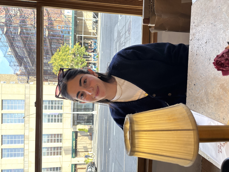 The image depicts a young adult female seated indoors at a light-colored table, looking directly at the viewer with a slight smile. She has dark hair, dark-framed sunglasses perched on her head, and wears a dark blue v-neck cardigan over a white shirt, accessorized with two gold necklaces and small gold hoop earrings. In the foreground to the left, a lit table lamp with an off-white pleated fabric shade occupies the lower portion of the frame. A small dark red decorative object is visible on the table surface in the bottom right, and a brown paper bag or holder is to the right of the woman. Through a large window with a wooden frame, an urban street scene in New York City is visible. Across the street, a multi-story, light-colored building with numerous rectangular windows features storefronts, one partially displaying "GUSTO ALTO," which identifies the location as Lafayette Street in New York, United States. Further down the street, another building is extensively covered in scaffolding and blue netting, indicating construction or renovation. A green tree stands between these buildings. The street contains paved lanes, a dark-colored vehicle, and pedestrians. A group of people are discernible seated outdoors at a distant establishment. The scene is illuminated by clear daylight under a blue sky.