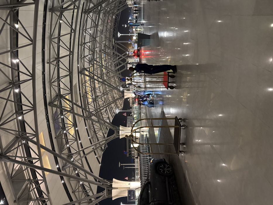 An indoor scene showcases the ceiling's architectural steel structure with repetitive triangular patterns. A man in dark attire pushes a cart through a shiny, reflective floor, alongside a line of empty luggage carts. Beyond the immediate interior, lights and outlines of buildings are visible against a dark sky. A black vehicle with its tire visible rests near a set of luggage carts.