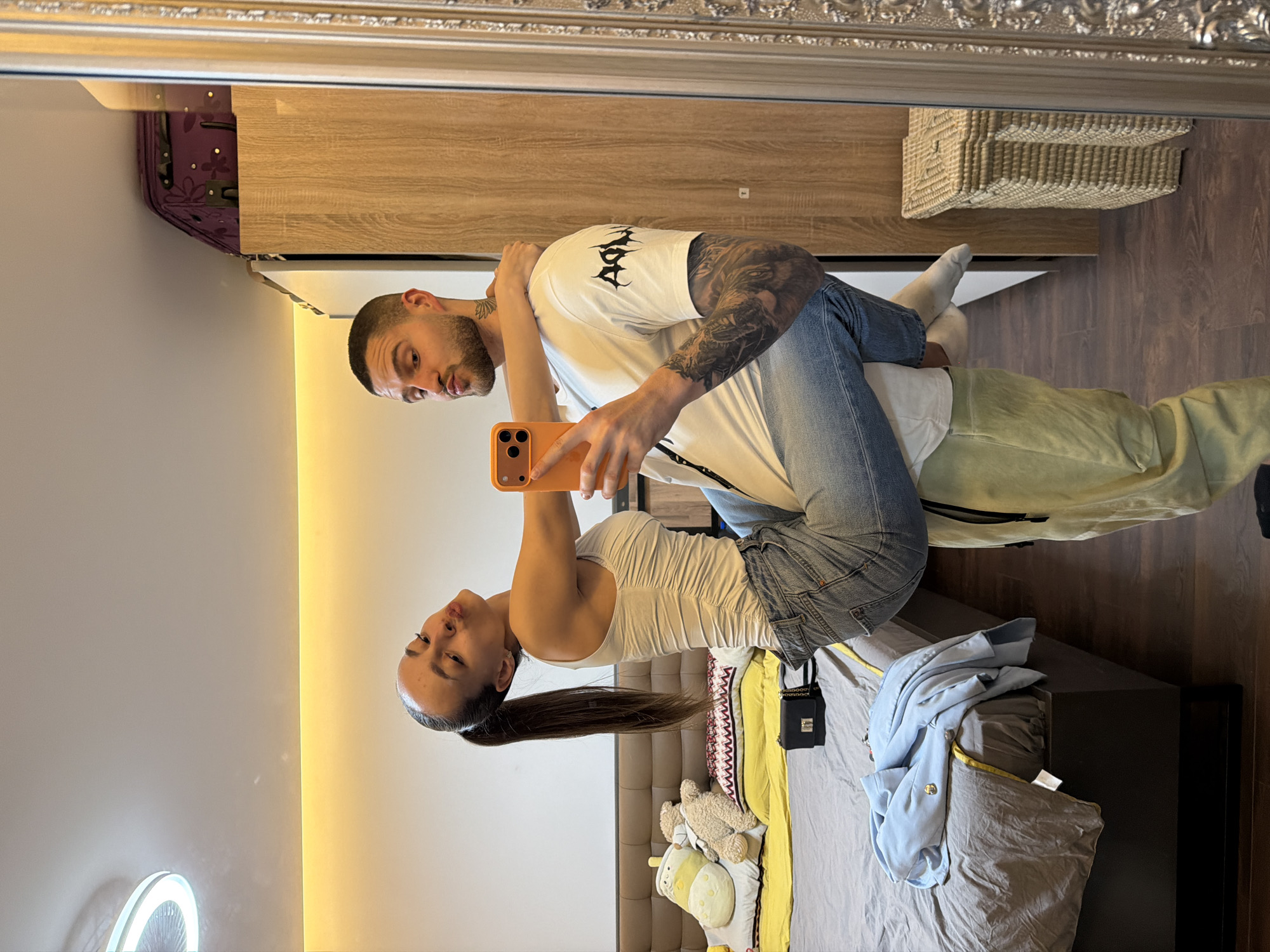 An adult male and female are depicted in an indoor mirror selfie, likely a bedroom, in Sofia, Bulgaria. The female, wearing a white ruched tank top and blue jeans, has long dark hair in a ponytail. She is held elevated by the male, her left arm around his neck, and her right hand holding an orange smartphone, capturing their reflection. Her lips are pursed. The male, with short dark hair, a stubble beard, and visible tattoos on his left arm and neck, wears a white t-shirt with a dark graphic on the sleeve and light green sweatpants. His lips are also pursed. Behind the individuals is a bed with a dark grey duvet, yellow pillows, a white and yellow stuffed animal, a brown teddy bear, a patterned cushion, a light blue jacket with a gold button, and a black handbag. The room features white walls, a brown headboard, a horizontal yellow accent light strip above the bed, and dark wooden laminate flooring. A light-toned wooden wardrobe topped with a dark purple suitcase and a wicker basket are visible in the reflection to the right of the subjects. A circular white ceiling light is reflected in the upper left corner.