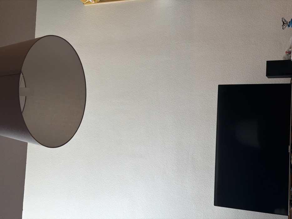 This image depicts an interior room in Eschau, France. The scene is dominated by a light-colored, textured wall (likely off-white or light grey) occupying most of the frame. Suspended from the white ceiling, in the upper portion of the image, is a cylindrical fabric lampshade, beige or light grey in color, with its interior visible. Below, a large, rectangular television with a dark, reflective screen is centered at the bottom of the frame. To the immediate right of the television, a black, rectangular electronic device (possibly a speaker or gaming console) stands upright. Further to the right, a small, blue and silver portable burner or stove is visible, positioned next to some crumpled white material. No individuals, actions, or direct interactions are visible within the static scene.