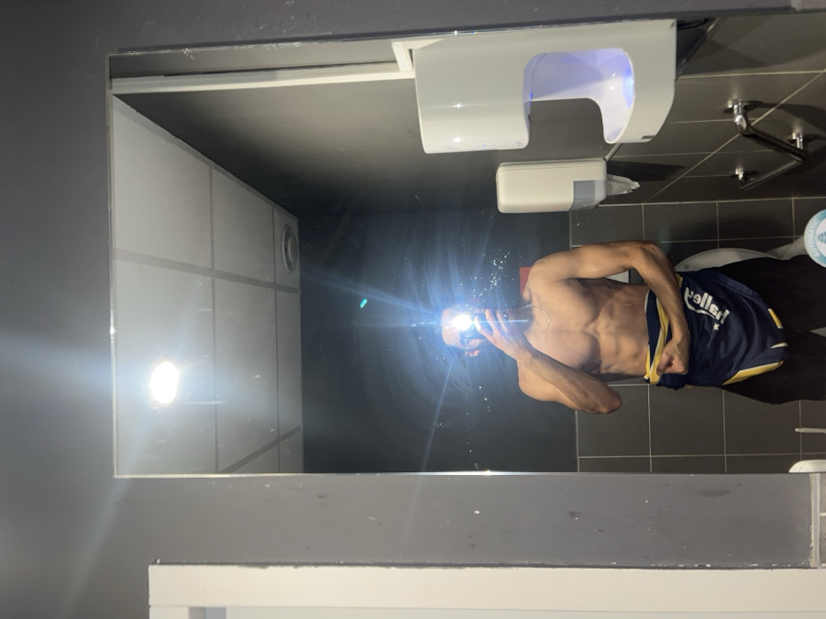 A person is reflected in a bathroom mirror. They are bare-chested and wearing dark shorts with yellow trim. The person is holding a phone up to their face, taking a picture of themselves. The bathroom has dark gray walls, a white tiled section, a hand dryer, and a paper towel dispenser. The lighting in the bathroom is bright.