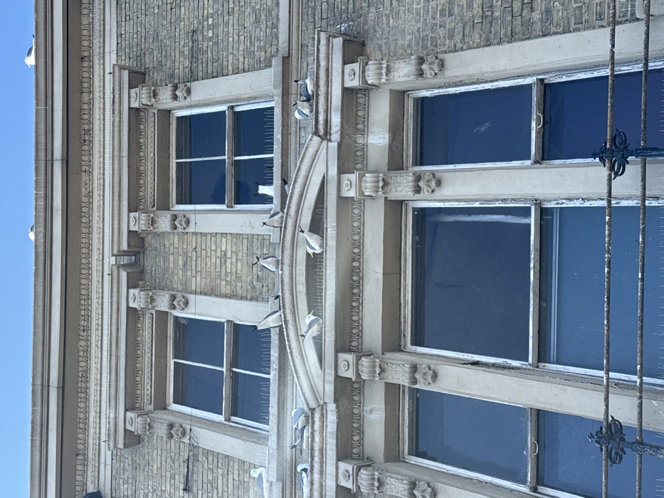 The image presents the upper facade of a multi-story building in East Suffolk, United Kingdom, under a clear blue sky. The building features light-colored brickwork and ornate architectural elements, including decorative cornices and pilaster-like mouldings framing two upper-level sash windows with white frames. Below these windows, and along a more elaborate lower decorative ledge incorporating a central arched pediment, numerous metallic anti-bird spikes are installed. Several live gulls are perched on the topmost roofline and on the left side of the upper ledge. Strategically positioned among the anti-bird spikes on both the upper and lower ledges are multiple realistic statues of black and white penguins, standing upright. One larger white bird statue, resembling a gull, is also visible on the lower left of the prominent lower ledge. A weathered, decorative iron railing is partially visible across the bottom of the frame, in front of lower-level windows.