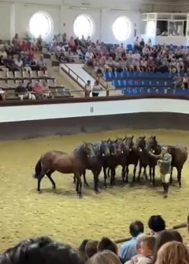 group of horses being presented in an indoor arena before a crowd. The arena has rows of stadium-style seating filled with spectators. The floor of the arena is covered in light brown material, possibly sand or packed dirt. In the center of the arena, a group of about ten dark brown horses stand together, loosely arranged in a line. A person dressed in light-colored riding clothes and high boots stands near the horses, gesturing with a stick or whip. The person appears to be directing or presenting the horses. The video is taken from a lower level of seating, looking up at the arena floor. The overall impression is of a horse show or exhibition.