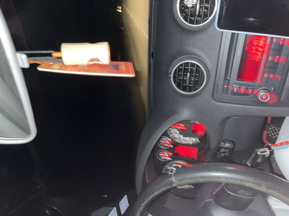 The scene depicts the interior of a vehicle at night, presumably in Elin Pelin, Bulgaria, as it travels on an illuminated road. No individuals are visible. The dashboard is black, with a black, textured steering wheel positioned on the left. Behind the steering wheel, the instrument cluster displays red-illuminated gauges. The center console features an "Audi concert" stereo head unit with red backlighting. To the right of the center console, two circular air vents are visible; the rightmost vent contains a decorative, flower-like element. A rearview mirror is mounted at the top center, from which an air freshener hangs, consisting of an orange/brown cardboard tag and a cylindrical beige object. A smartphone with a dark screen and a light-colored case rests vertically on the right side of the center console, adjacent to the stereo. Keys on a keyring with red and blue elements hang from the ignition, located below the steering column. Part of a metallic foot pedal with a diamond plate pattern is visible in the lower left of the frame. The exterior environment is dark, with the road ahead illuminated by the vehicle's headlights, revealing lane markings and faint distant vehicle lights.