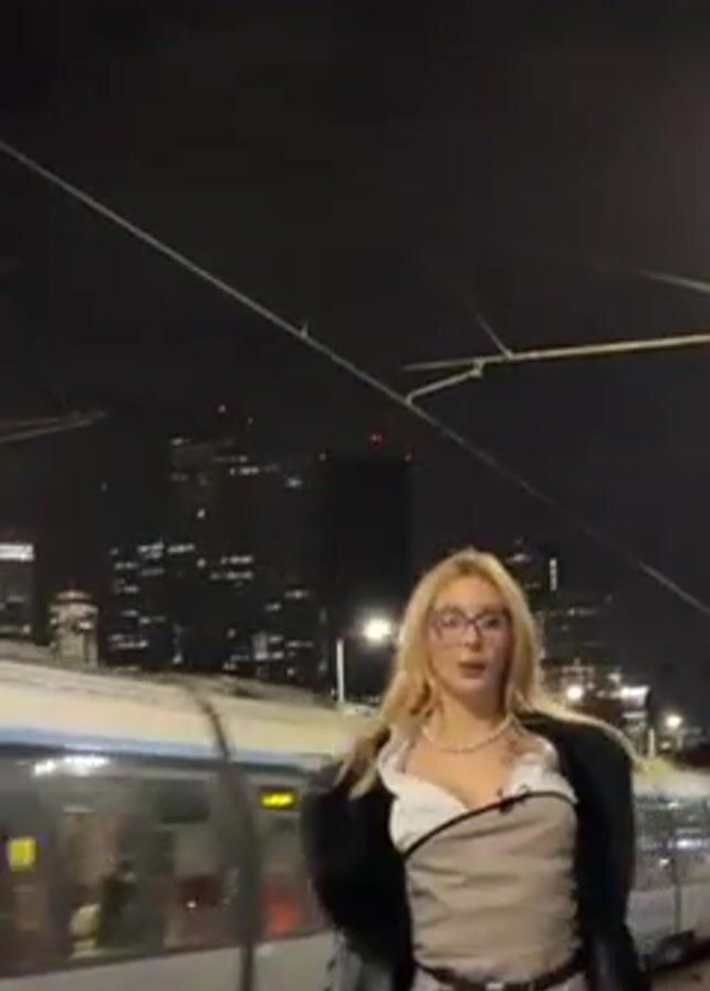 A woman with long blonde hair, wearing large-framed glasses and a pearl necklace, poses at a train station at night. She is dressed in a layered outfit consisting of a white shirt, a beige corset-style top, a black jacket, and a belt. A train passes behind her as she adjusts her jacket and turns to face the camera. The background reveals a cityscape with illuminated buildings against the night sky. The camera angle shifts slightly while focusing on the woman and the moving train.