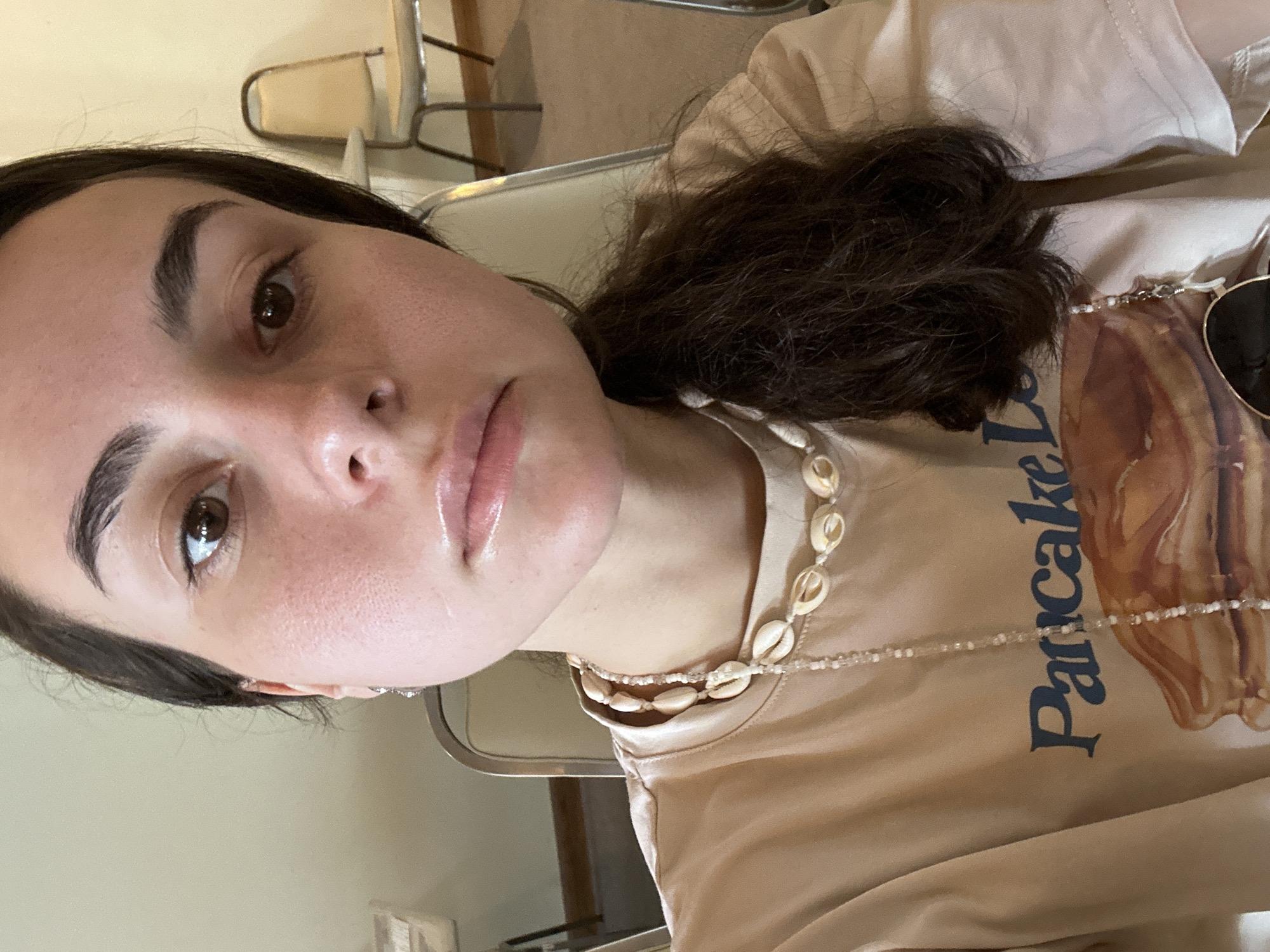 A close-up photograph features a woman with dark brown hair, prominent eyebrows, and brown eyes. She has fair skin with a slightly shiny complexion, particularly on her lips. She is wearing a light brown t-shirt with the word "Pancake" vertically printed on the front in a dark blue font. An image of pancakes is also visible on the shirt. She is wearing a necklace made of small seashells and clear beads. A pair of sunglasses is clipped onto the collar of her shirt. The background is somewhat blurred, showing glimpses of chairs and light-colored walls. There is no information to conclude location within the city of Pattaya City, Thailand.