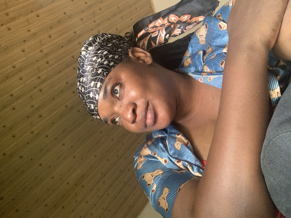 A single individual, appearing to be an adult female with a medium-dark complexion, is depicted from the chest up in an indoor setting