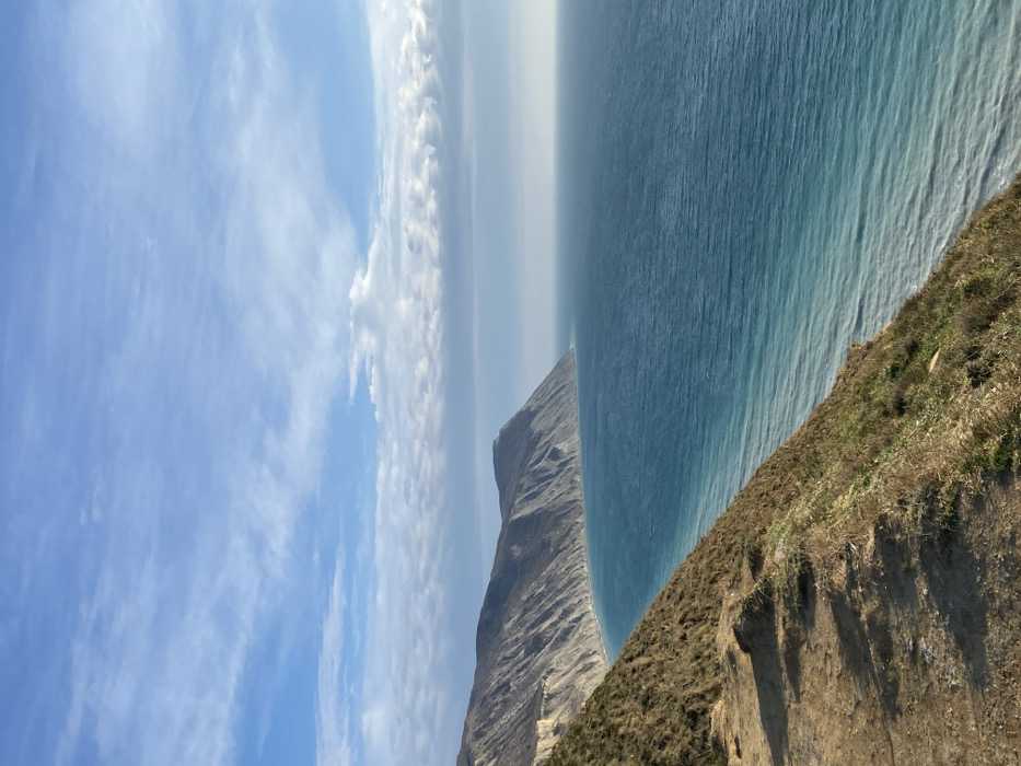 The image displays a panoramic view of the Black Sea coastline near Anapa, Russia, specifically depicting the mountainous terrain and sea southeast of the city, likely along the route towards Sukko or Bolshoy Utrish. The scene is dominated by natural elements under a partly cloudy sky. In the foreground, on the left, a steep, unpaved dirt path or trail runs along the edge of a vegetated cliff. The vegetation consists primarily of dry, sparse grass and small shrubs, displaying shades of brown and muted green. The cliff face descends sharply towards the sea. The midground features the expansive Black Sea, which exhibits varying shades of blue and turquoise, with lighter hues closer to the shore, indicating shallower water or reflective sunlight. Small ripples are visible on the water's surface. Along the horizon, the sea transitions to a hazy, lighter blue. On the left side of the midground, a significant mountain range with distinct grey and beige layered rock formations extends along the coastline, curving into the distance and forming a promontory. These mountains appear rugged and show visible signs of erosion. The background consists of a clear blue sky interspersed with scattered white clouds. The upper sky contains wispy cirrus clouds, while mid-level clouds are more defined cumulus formations. No people, animals, or man-made structures are visible. No actions or interactions are depicted within the scene.