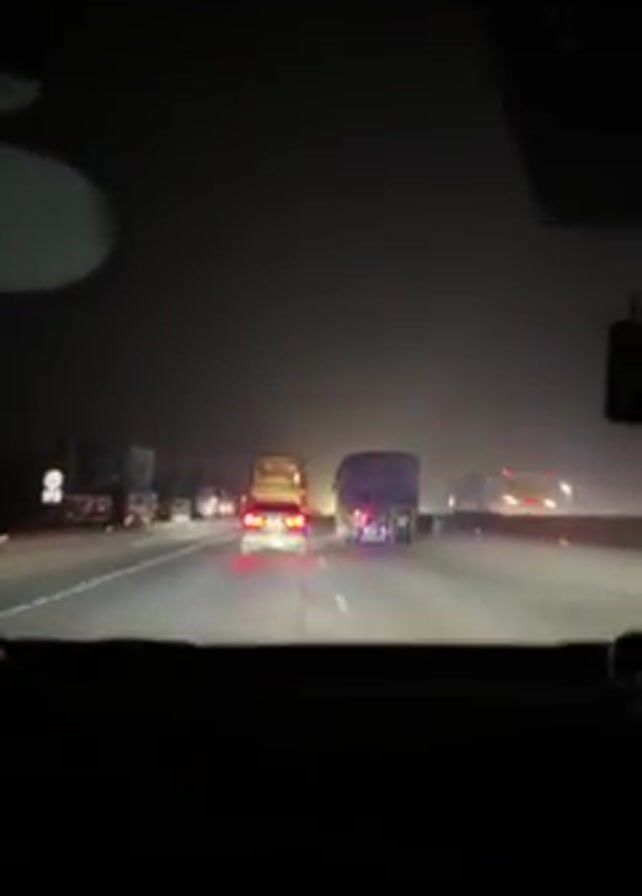 The view from inside a car at night shows traffic on a highway. The highway has multiple lanes. Several cars, buses, and trucks are ahead in the same direction. Tail lights and headlights are visible. The environment appears dark and possibly foggy.