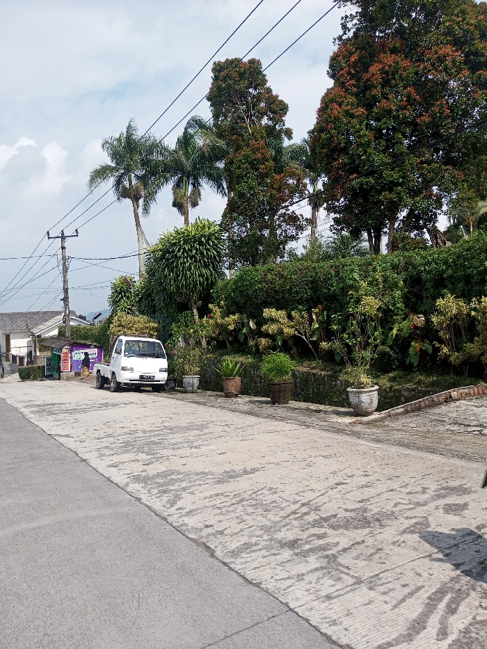 The image portrays an outdoor scene in Sandamal Eliya, Sri Lanka, under a partly cloudy sky. A paved road, consisting of two distinct concrete sections, occupies the foreground; the section on the right features a heavily textured surface. A white, single-cab pickup truck is parked on the left side of the road, oriented towards the viewer. Behind the truck, a wooden utility pole supports multiple overhead power lines that extend horizontally across the upper frame. A single individual is partially visible standing near a small green structure and a purple sign on the far left, behind the truck and utility pole. A white building with a reddish-brown roof is visible further back on the left, with additional distant rooftops suggesting a residential area. The right side of the scene is characterized by dense, lush vegetation, including several tall palm trees, large trees with reddish-brown leaves, and various green shrubs. A raised concrete sidewalk runs alongside the road on the right, adorned with multiple potted plants of varying types and sizes.