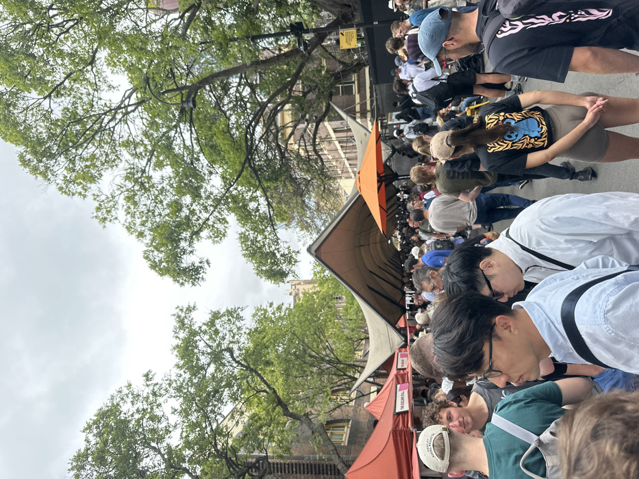A bustling outdoor scene with a dense crowd under orange-roofed stalls and tents. People are closely packed, many looking downward, possibly at vendors or displays. Trees with lush green leaves frame the top and left sides, contrasting with a cloudy sky. Buildings are visible in the background, suggesting an urban setting. The photo is oriented sideways, giving a tilted perspective of the event.