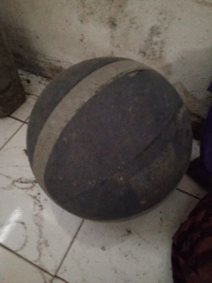 A worn, dusky blue ball with a faded gray stripe rests on white tiled flooring. The background features a damp, stained wall, suggesting a neglected indoor space. There are other indistinct objects near the ball and on the tiles, contributing to the overall impression of age and disuse.