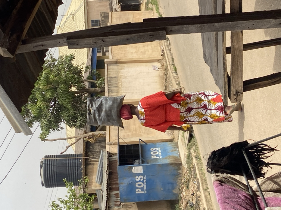 An outdoor scene in Jos, Nigeria, depicts a person walking away from the camera on a paved road. The individual, dressed in a red top, a patterned skirt with white, yellow, and maroon designs, and a red headwrap, carries a large, dark grey sack balanced on their head. They wear flip-flops and hold a yellow object in their right hand. To the immediate left in the foreground, a dark, wet-looking wig and a piece of pink/purple fabric are draped over a metal rack. To the right, a wooden support structure with a corrugated metal roof partially obstructs the view. In the midground, to the left of the walking figure, stands a blue metal kiosk with "POS" and "PAY YOUR NEPA BILL" written in white text on its front panels. The kiosk has a small serving window. Behind the kiosk, a black water tank rests on the roof of a building. The background features a concrete wall running parallel to the road. Beyond the wall, several residential-style buildings with light-colored walls and varying roof types (some corrugated metal, some painted) are visible under a hazy sky. Green-leafed trees are interspersed throughout the background, including a prominent one behind the walking figure, and a smaller, bare tree branch is also present. The ground appears dusty in areas adjacent to the road.