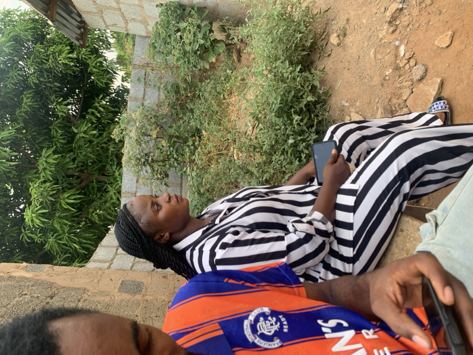 The scene depicts two individuals outdoors in the city of Bwari, Nigeria. In the foreground, on the left, the upper torso and right arm of a person are visible, wearing an orange and blue striped shirt with a "RANGERS FOOTBALL CLUB" logo and text. This individual is holding and interacting with a black smartphone. To the right, a woman with dark skin and black braided hair is seated, looking towards the viewer's right. She is wearing a black and white vertical striped long-sleeved shirt and matching trousers. Her left hand rests on her lap, holding a black smartphone. Her feet, clad in sandals with a star pattern, are partially visible. The ground is reddish-brown dirt with scattered small rocks. Behind the woman, a low wall constructed from grey concrete blocks is visible, beyond which lies an area of dense green vegetation. A large tree with abundant green leaves is present in the background, and a section of corrugated metal roofing is visible on the far right. No direct interaction between the two visible individuals is apparent.