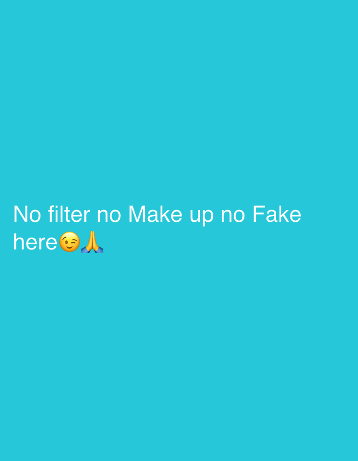The image is a solid turquoise background with white text that reads "No filter no Make up no Fake here". At the end of the text string, there are two emojis, one is a winking face with tongue and the other is folded hands.