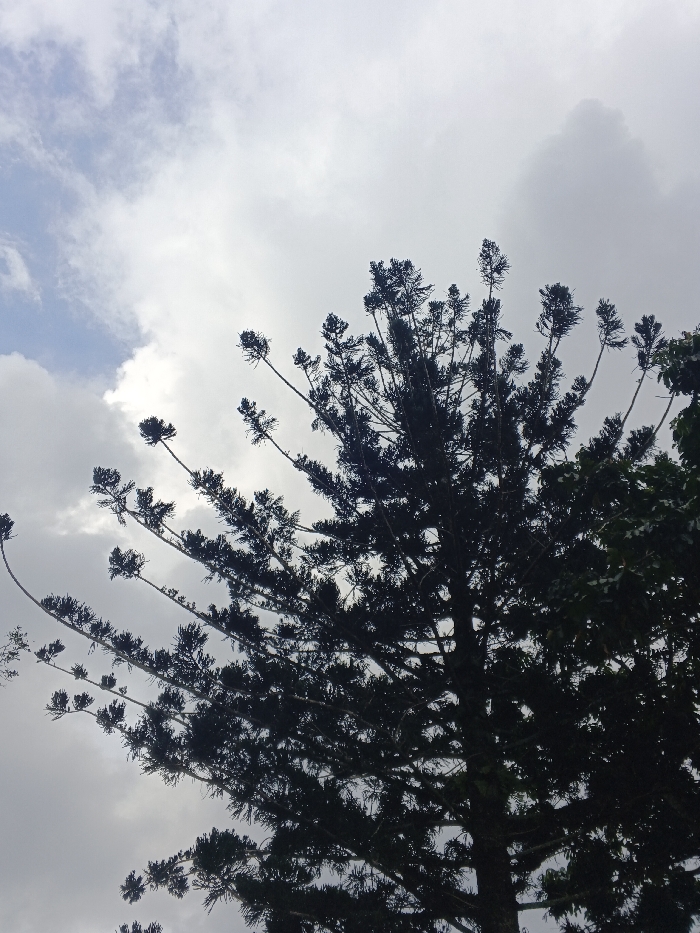 The image displays an upward-angle view of a large tree, identified as being located in Lokossa, Benin. The tree occupies the lower two-thirds of the frame, presenting a dense, dark silhouette of its canopy and branches against the sky. Its numerous branches extend upwards and outwards, terminating in clusters of foliage. The background consists of a predominantly overcast sky, filled with light gray and white clouds. A distinct patch of light blue sky is visible in the upper left quadrant of the image, contrasting with the surrounding cloud cover. No individuals, artificial structures, or observable actions are present within the scene.